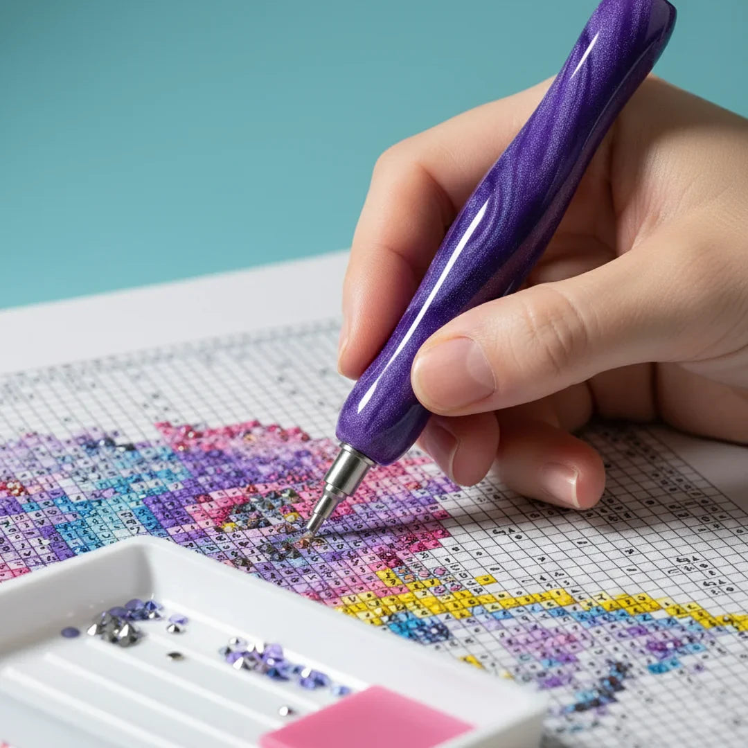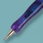 Precisie ontmoet design: de kleurvariant Sterrenstof-Purper toont diepviolette glans met fijne blauw-turkooizen glitterdeeltjes – een subtiele galaxy-look. Aan één zijde is de Forever-RVS single-placer punt (met schroefdraad) al voorgemonteerd: navulbaar, zeer duurzaam en ideaal voor het strak en puntgaaf plaatsen van steentjes.