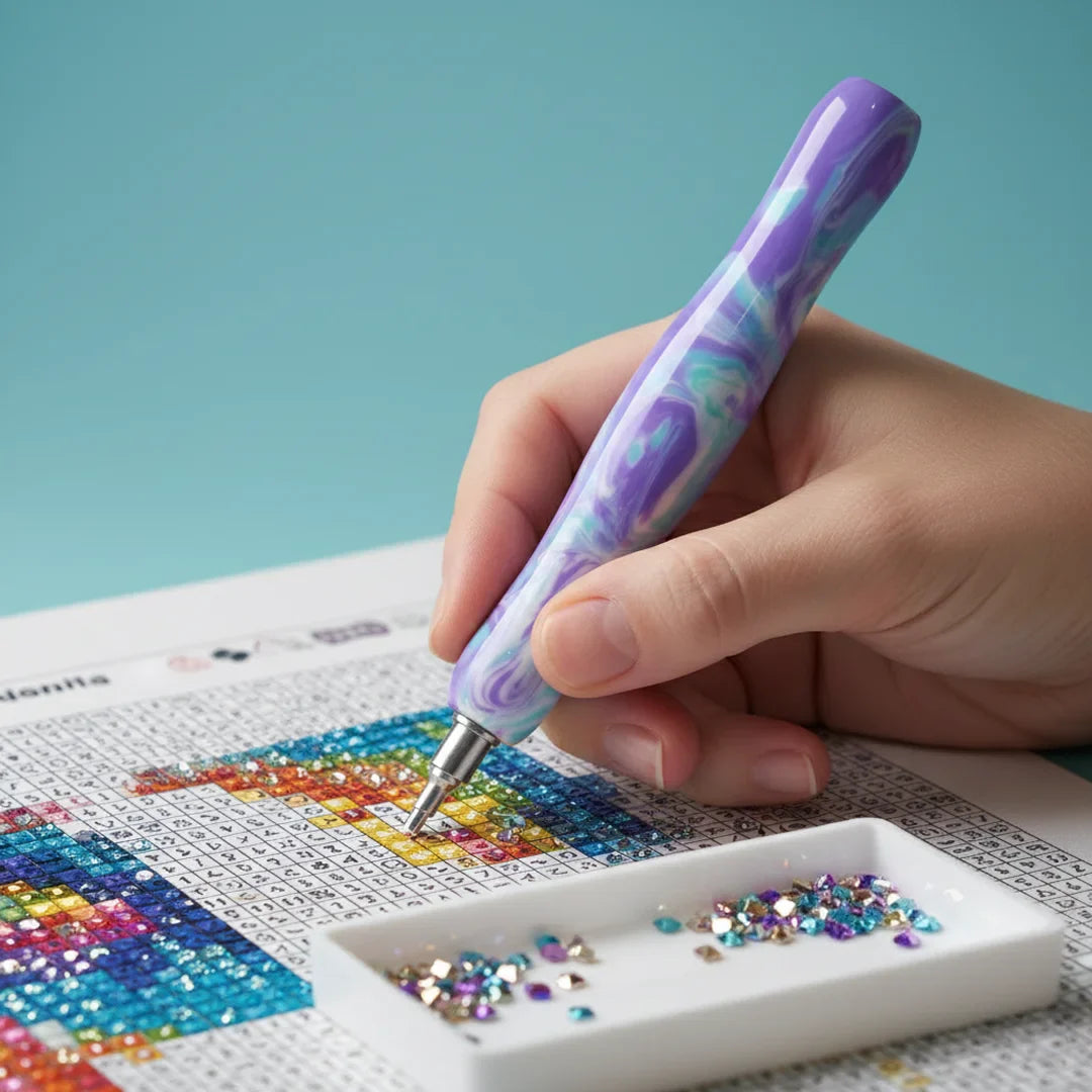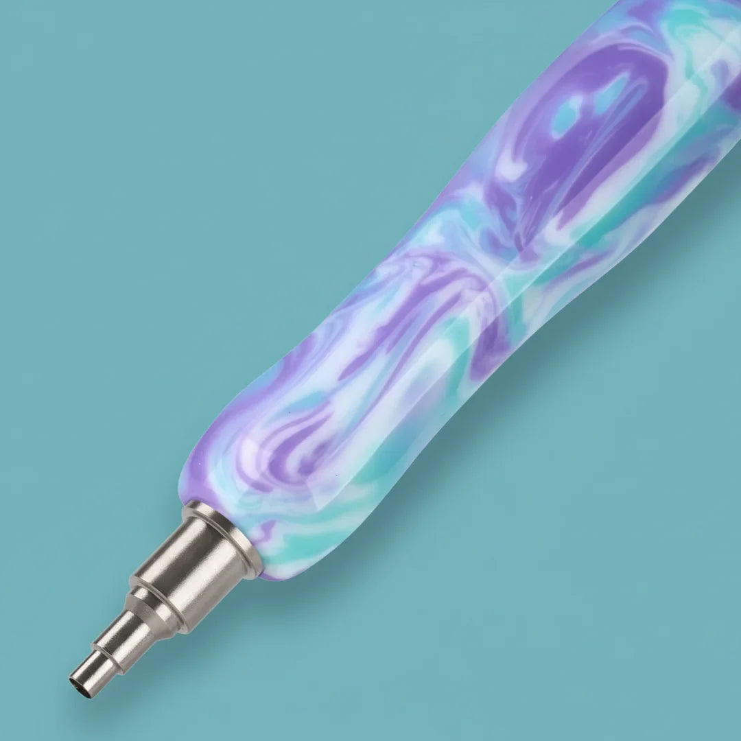 Til je diamond painting naar een hoger niveau: deze variant Poollicht-Lila met glanzende lila-/aqua-marmerlook combineert stijl met maximale precisie. Aan één zijde is de Forever-RVS single-placer punt (met schroefdraad) al voorgemonteerd – navulbaar, zeer duurzaam en perfect voor het schoon en uiterst precies plaatsen van steentjes.