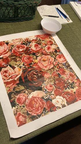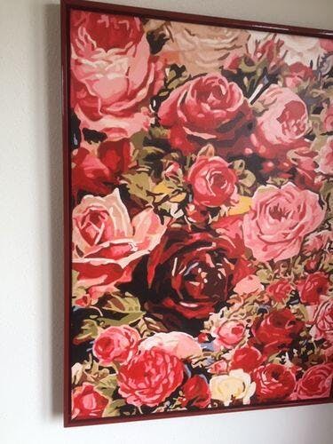 Met plezier heb ik aan dit 50x65 grote doek gewerkt. materialen had ik voldoende en ook de verf was in orde. Aan het eind gaf mijn vrouw de suggestie de lijst die we ook aangeschaft hadden rood te verven. zie foto. Het was een genoegen.