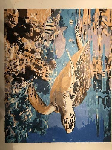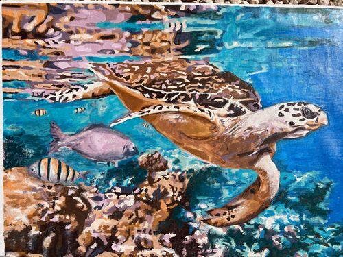 Waar kan je beter zo’n onderwater tafereel maken dan hier op Curaçao. Heerlijke verf, ruim voldoende hoeveelheid. Ik zou het perfect vinden als er een kleurenprint op A-4 formaat bij zou zitten, want soms weet je niet wat je precies aan het verven bent. . Een gladde vis verlangt een andere penseelstreek dan het harde koraal of een zee-anemoon.